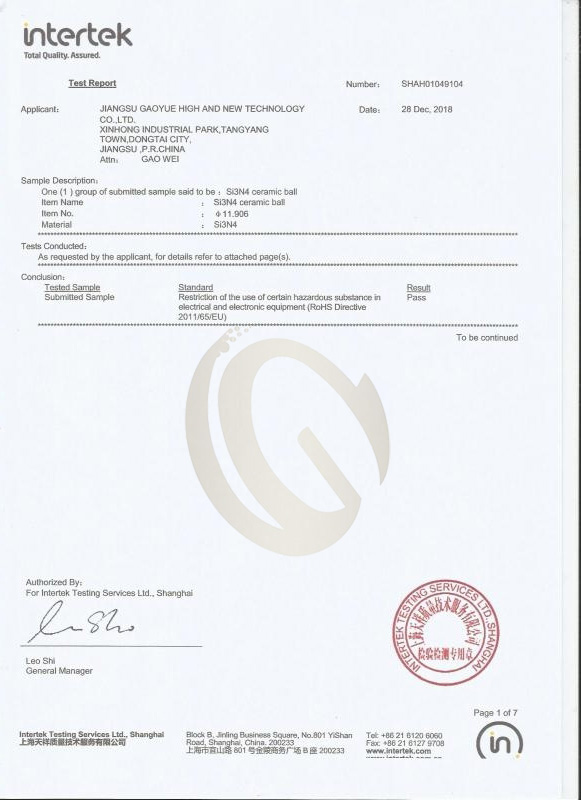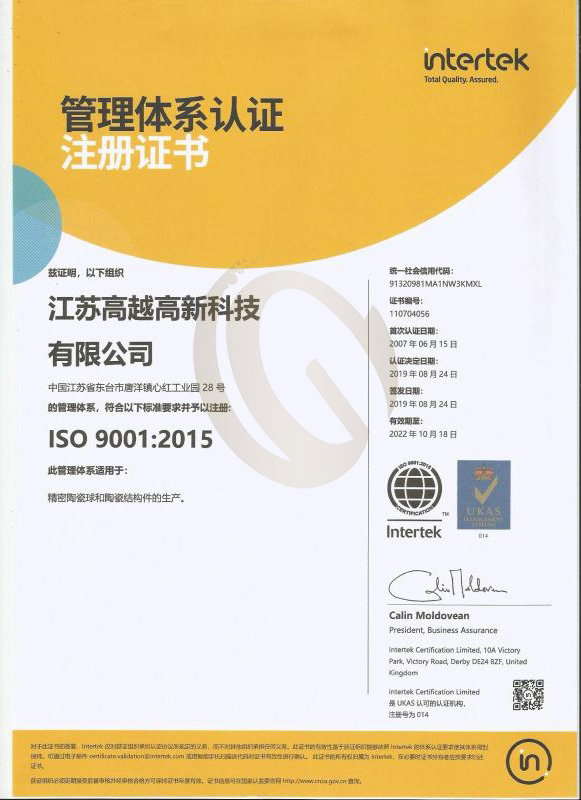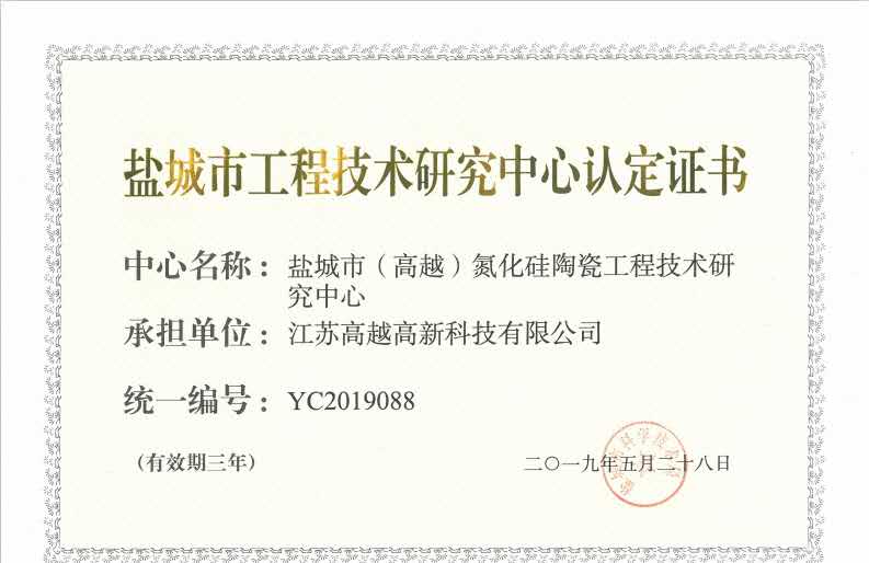 质量监控:ISO9001质量体系管理认证和ROSH认证 国家高新技术企业和盐城氮化硅研发中心认证